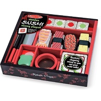 Add wasabi, if you like! This elegant wooden sushi play-food set is packed in a beautiful storage box and includes sliceable sushi rolls, shrimp, tuna, easy-use chopsticks, a cleaver and more. Sushi rolls make realistic chopping sounds when sliced!