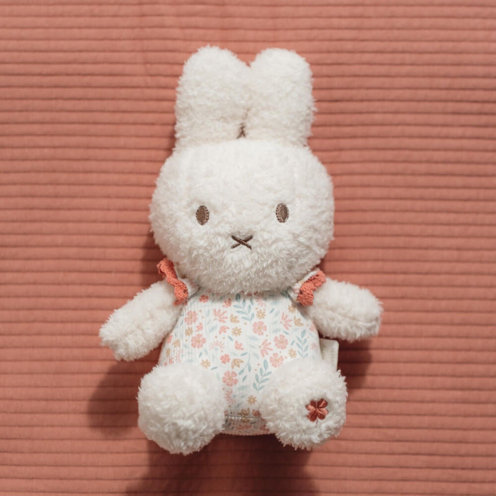 Cuddly Miffy is made of soft plush and printed corduroy and stands at 22cm tall. She is dressed in Lucky Blossom print, a Little Dutch design.