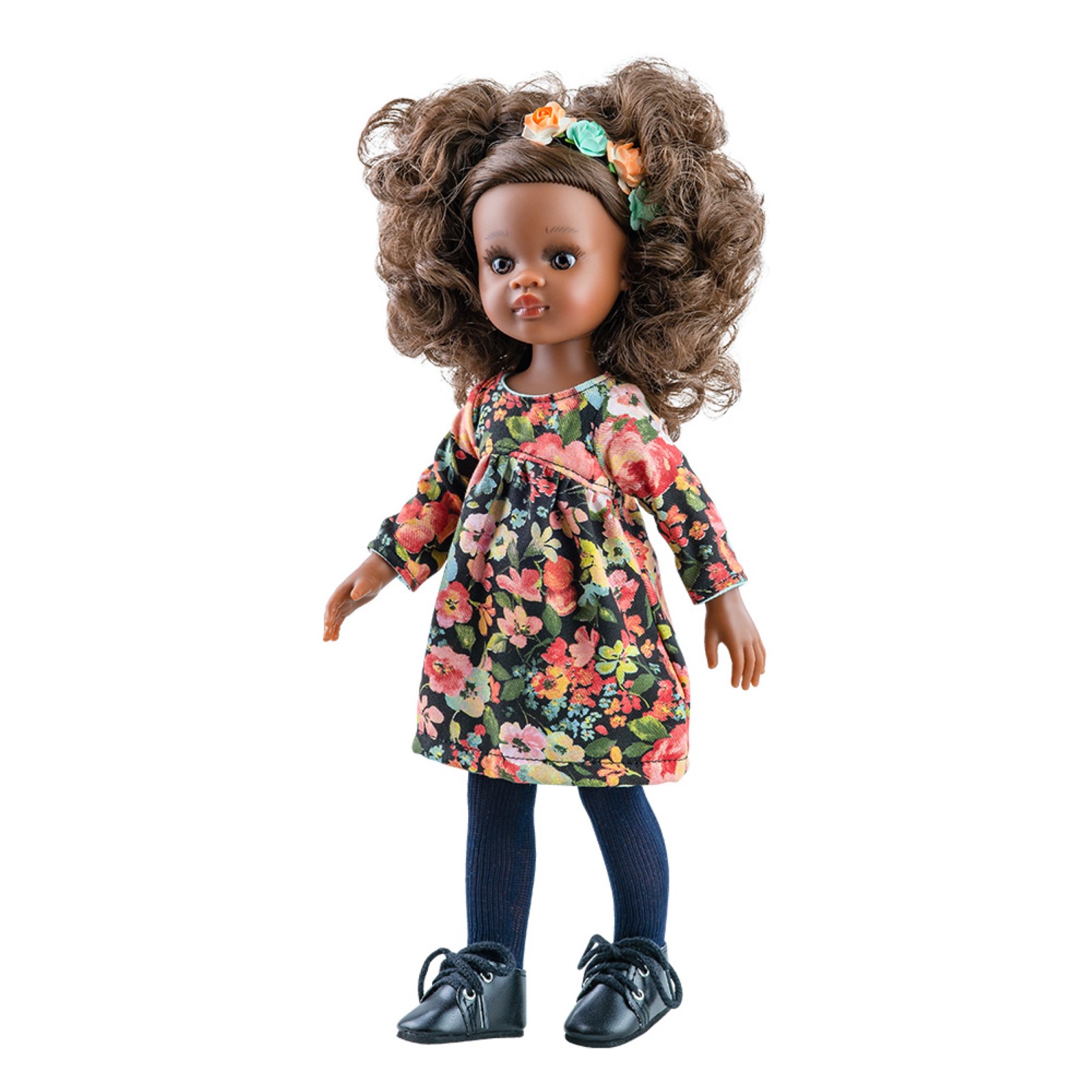 Nora is a 32 cm vinyl doll with gorgouse brown curly hair and brown eyes with a clear complexion.. Nora is dressed in a gorgeous long sleeved floral pattern dress with a matching floral headband in her luscious hair. She has black tights and lace up black shoes on her feet to complete her outfit.