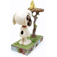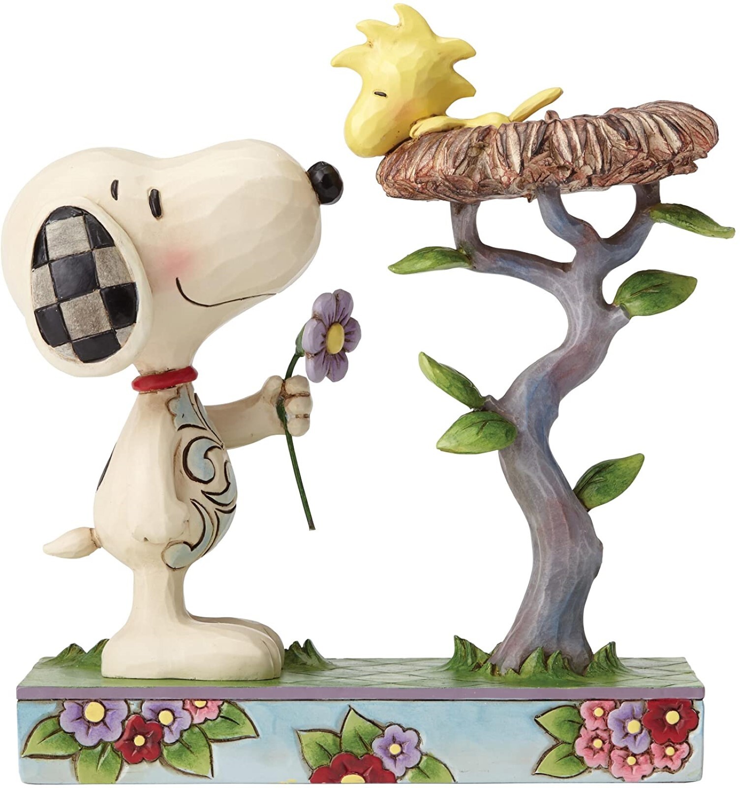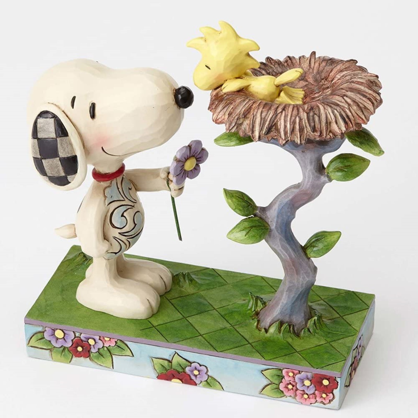 Snoopy visits his dear friend Woodstock's new home in this cheerful figurine, bringing a purple daisy as a nest-warming gift. Handcrafted and hand-painted, the design is sculpted from high-quality stone resin for a lifetime of love.
