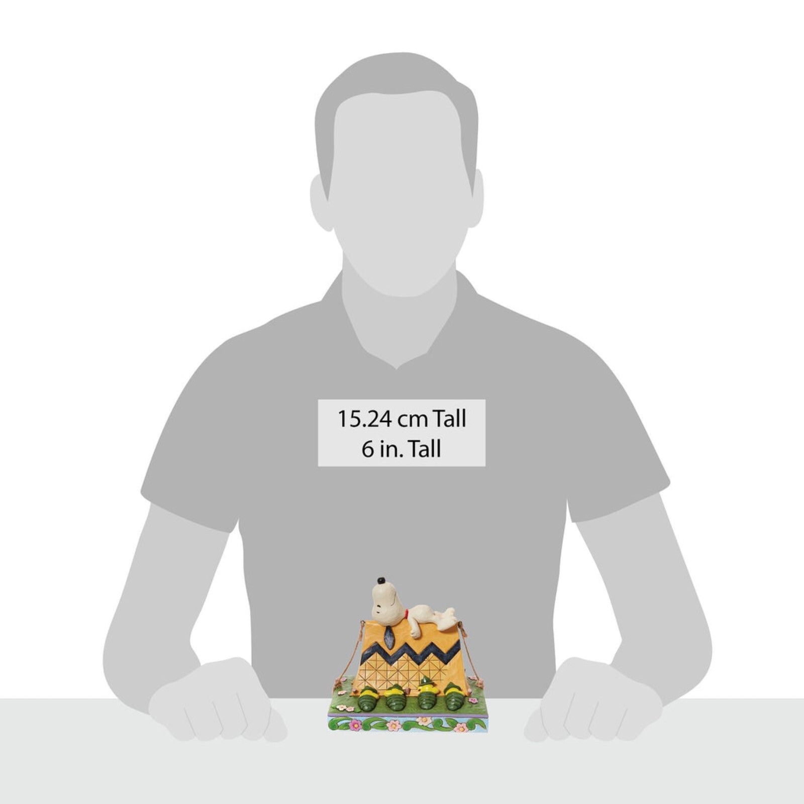 Snoozing at the top of a Charlie Brown zigzag tent, Snoopy enjoys a night in nature under the stars. Taking the camping trip more seriously, Woodstock and company each wear a camp ranger hat from a sleeping bag. Launch into Spring with Jim Shore.