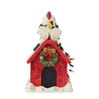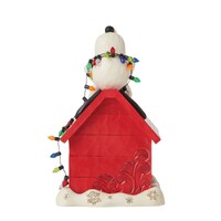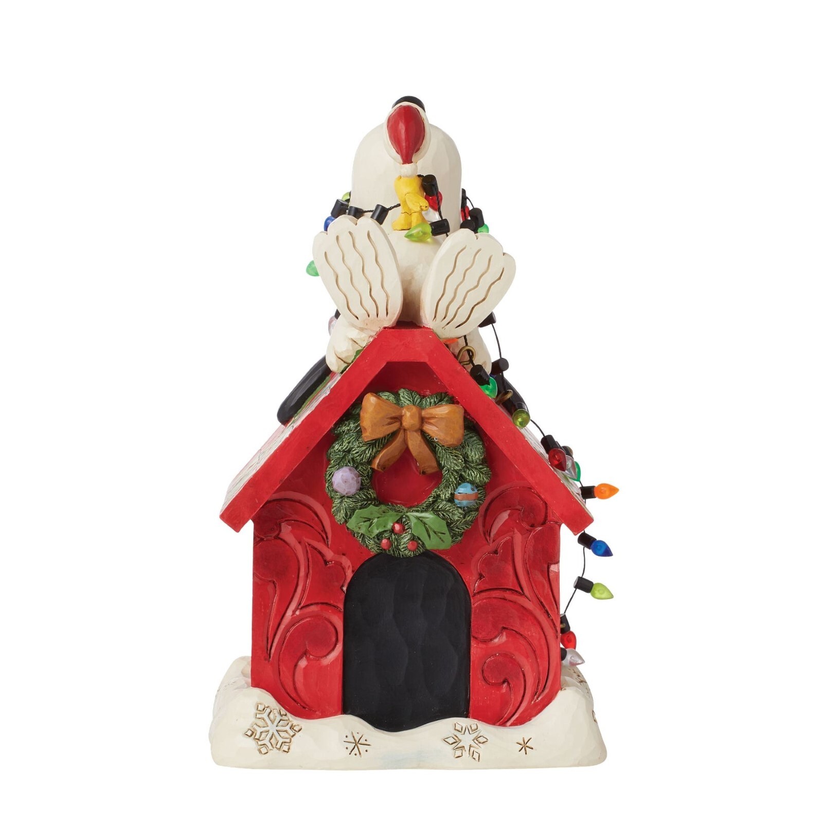This playful Christmas countdown calendar from Jim Shore shares a scene of a sleeping Snoopy on top his doghouse. Wearing a Santa hat, Woodstock has decided to decorate around the sleeping dog, and can be seen wrapping lights around Snoopy's nose.