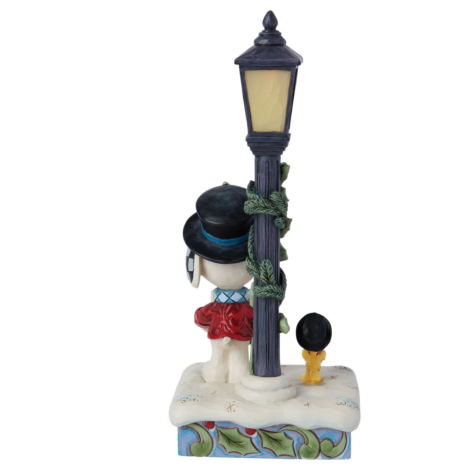 This festive creation from Jim Shore shares a classic holiday caroling scene set in the snow. Singing beside a light up lamp post decorated with garland and mistletoe, Woodstock and Snoopy spread Christmas spirit with song and style.