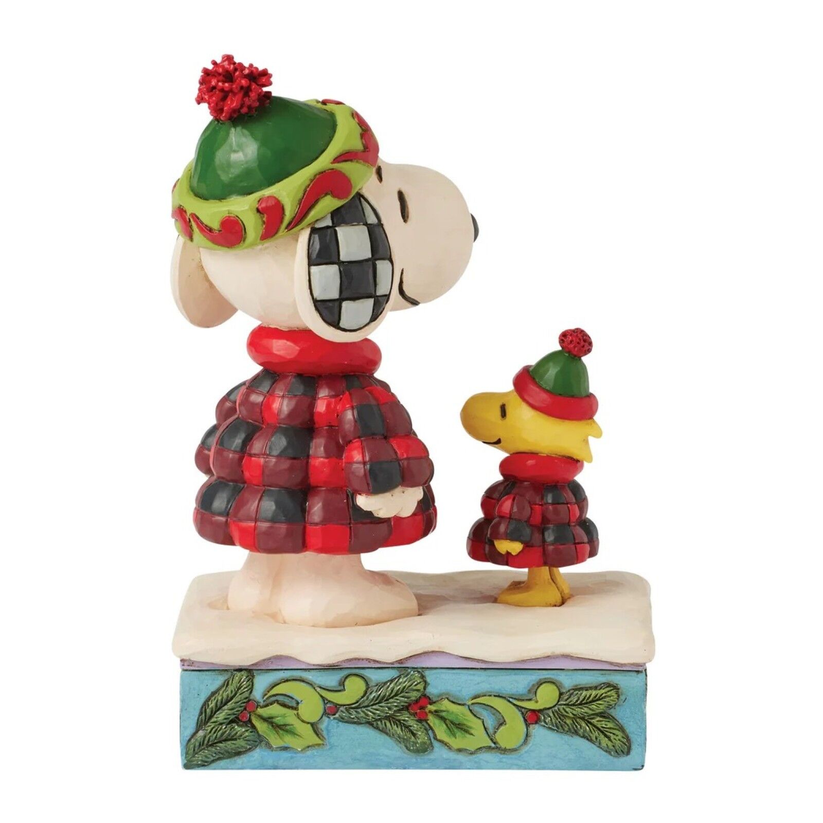 Celebrate the winter season with this cozy Jim Shore design of Snoopy and Woodstock bundled up in matching puffer jackets. Complete with knit caps, they delight in a snow day with Jim Shore's signature charm and style.