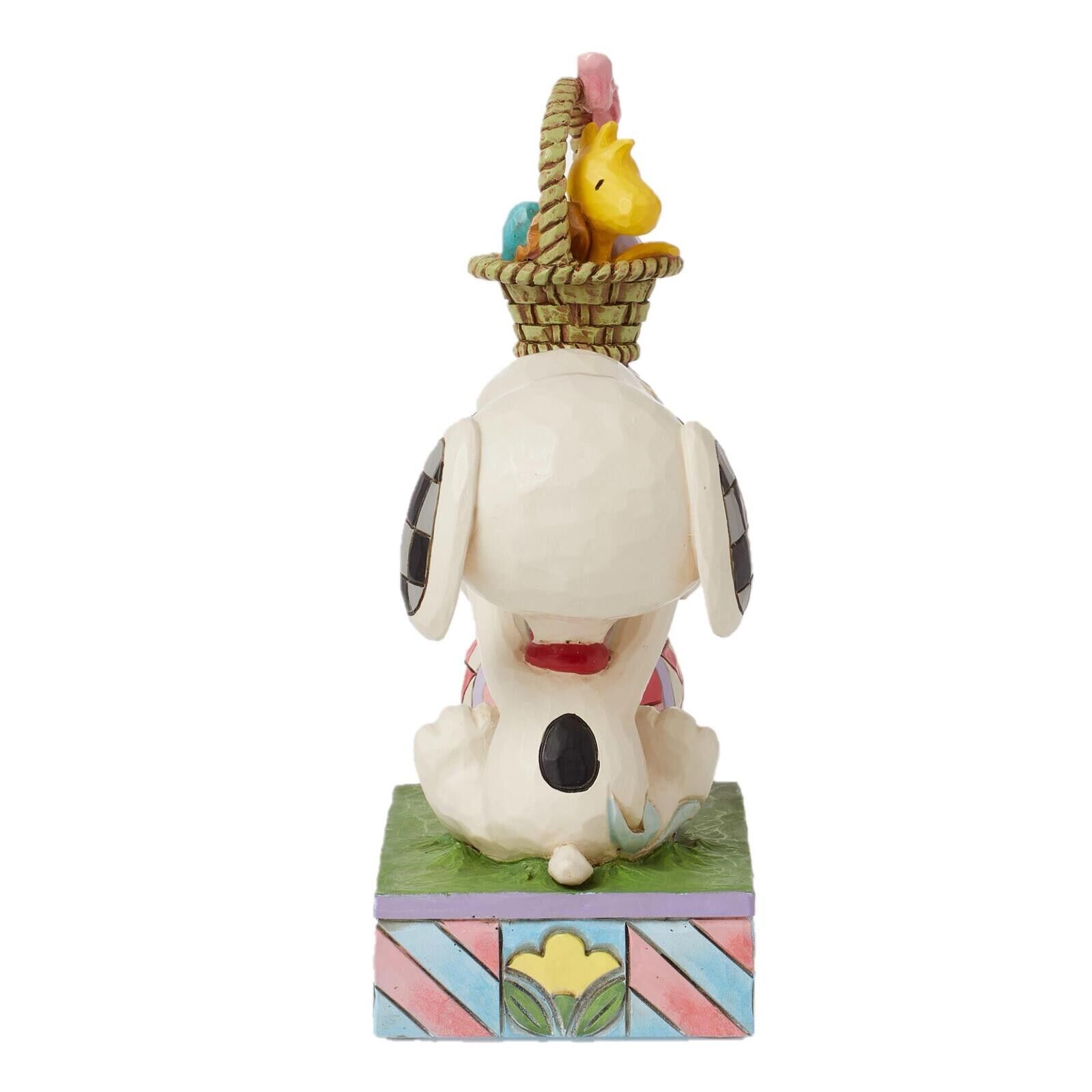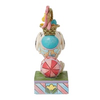 In this charming Jim Shore creation, Snoopy stacks intricately patterned Easter eggs while Woodstock balances atop them inside a basket, enjoying the festive scene below. Jim Shore's details capture the whimsy and joy of Easter and the Peanuts.