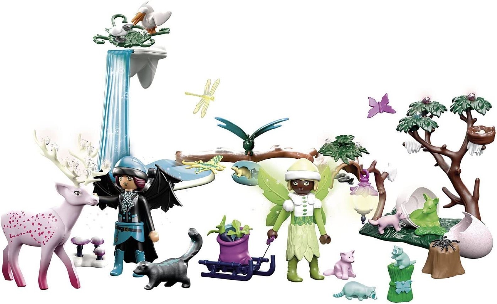 Set includes two fairies with their spirit animals - the fawn and skunk, forest landscape, assorted animals, and plenty of forest decorations for a magical Christmas in Ayuma.