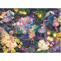 A glow in the dark puzzle showing floral fairies fluttering around a moonlit garden.