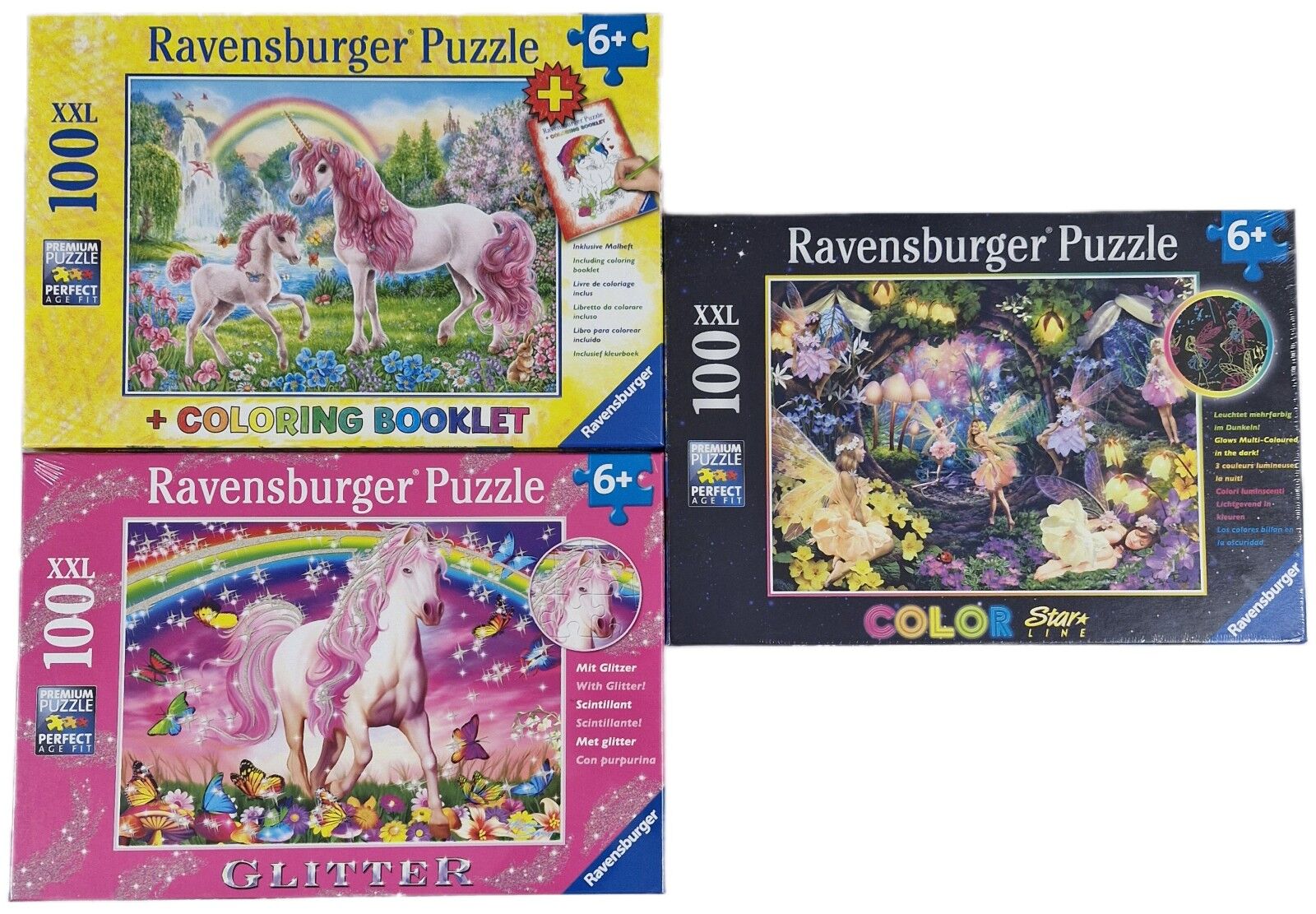 Ravensburger Puzzle 100pc Bumper 3 Pack - Glitter Starline - Fairies & Unicorn