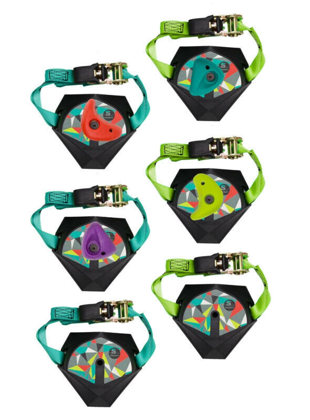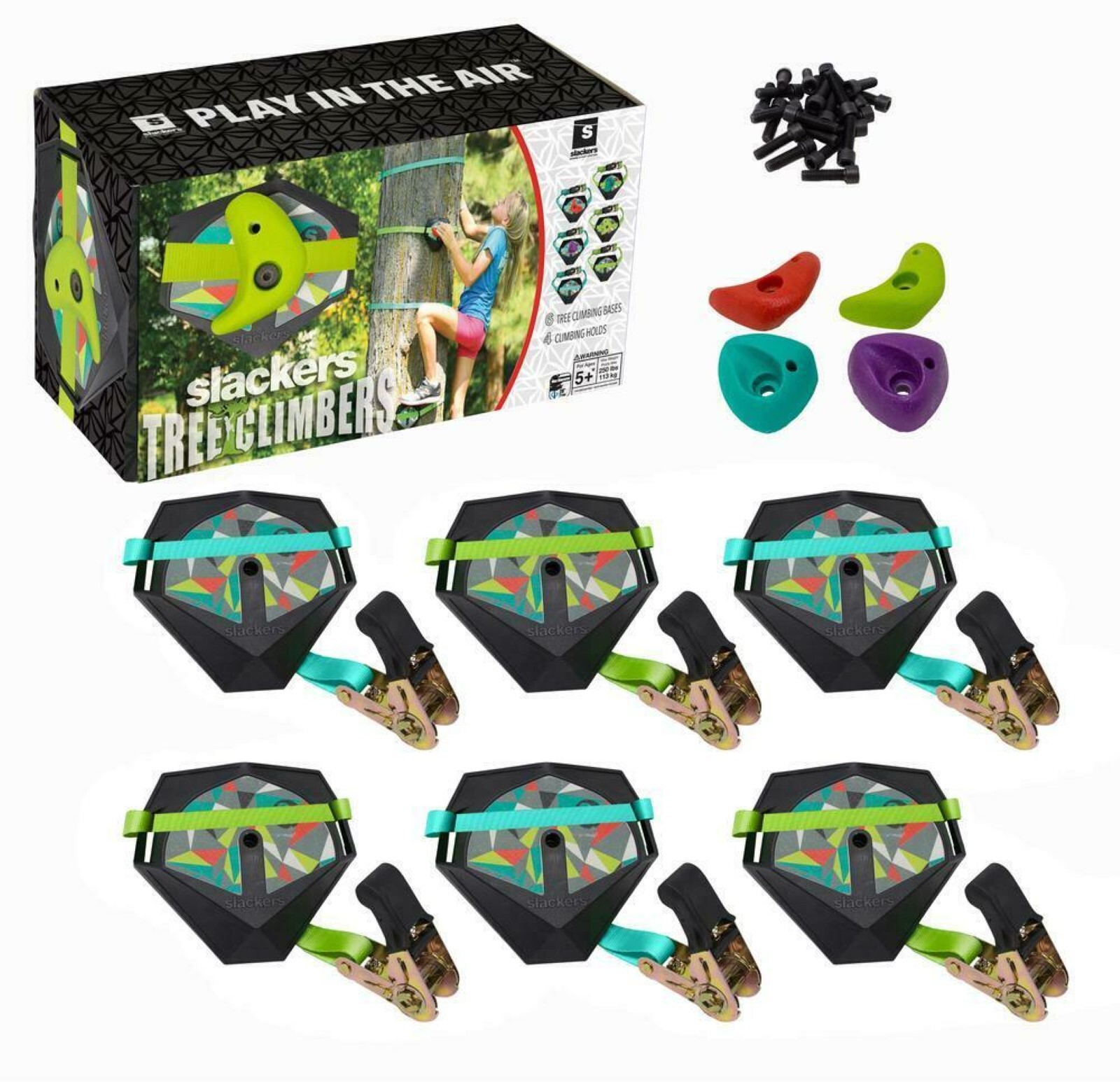 Take the ground out of playground. Now you can reach new heights with this Tree Climbers kit. The set includes 6 bases with ratchet straps and 4 climbing holds (the bottom 2 bases are foot holds). Tree Climbers are easy to install without harming a tree. Since they are easy to install and adjust, you can set them up for smaller children or for adults.