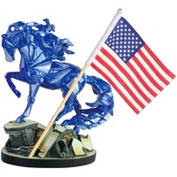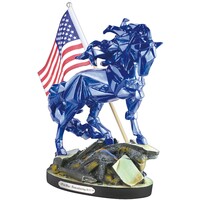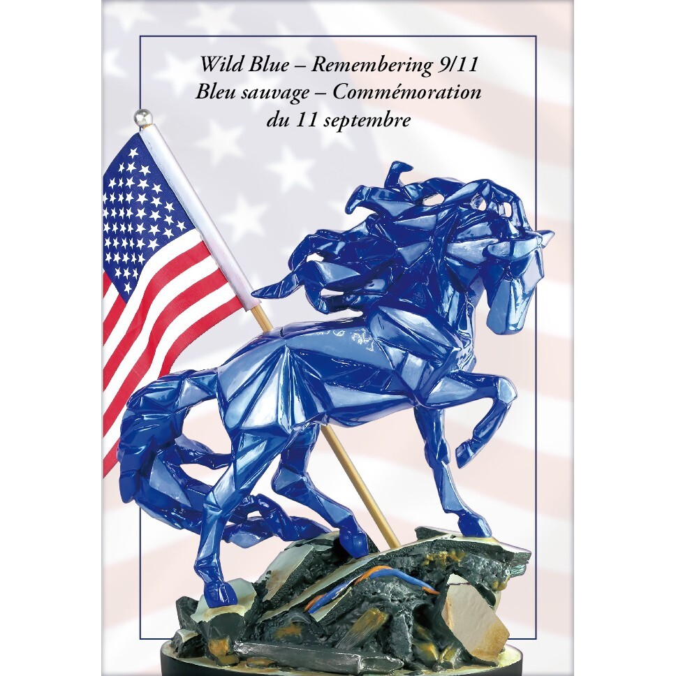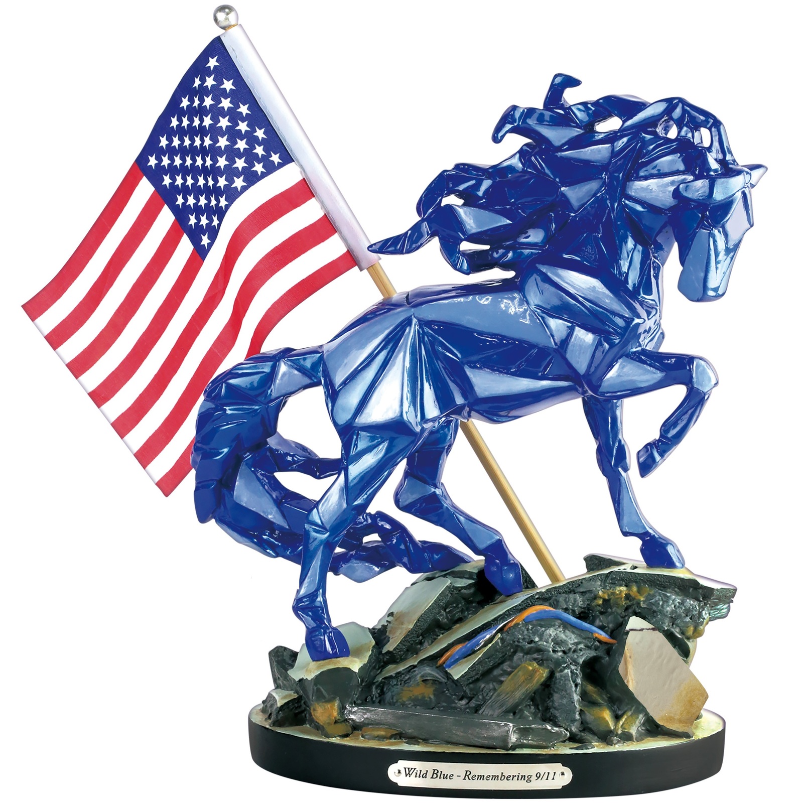 With this image in mind, I conceived of a Painted Pony that utilized the same form that The Trail created for a previous tribute to 9/11 titled "Unconquered," which posed a white stallion triumphantly atop rubble intended to represent the collapsed Twin Towers, with an American flag behind it. But instead of a white horse, this piece would feature a faceted blue horse. Blue because the lights in the Tribute of Lights were blue. Faceted to represent the 43,600 windows that were part of the Twin Towers, as well as the venues on the top floors of the North Tower which were called Windows on the World. The title - "Wild Blue" - borrows the name of a restaurant in the North Tower that was destroyed