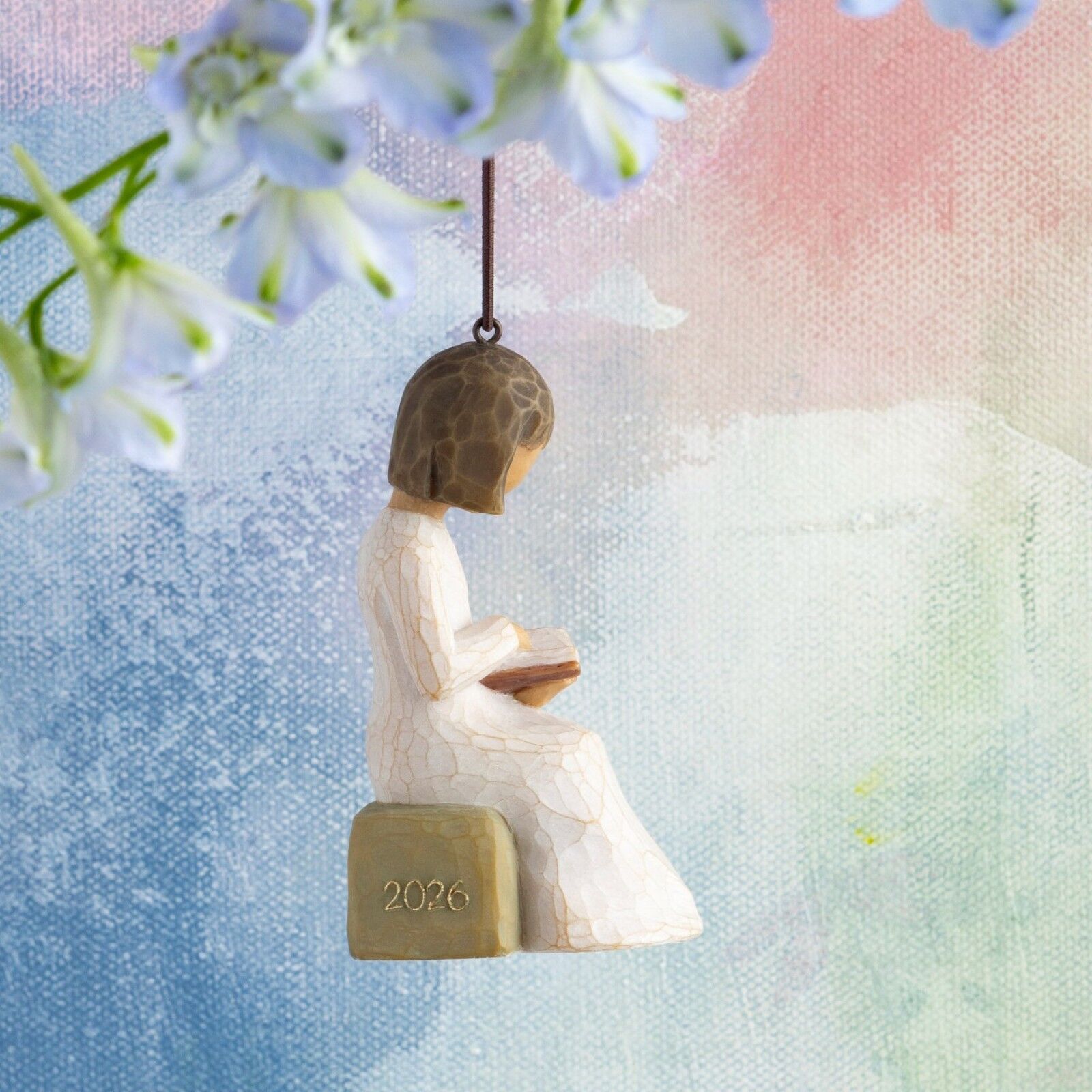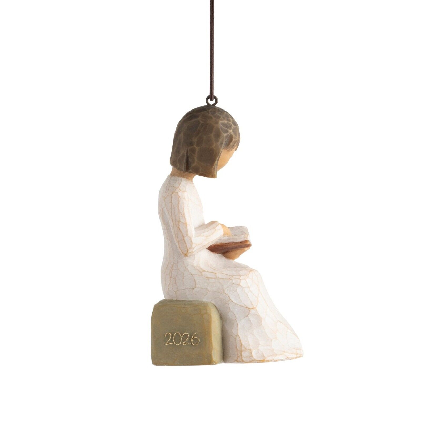 2026 Hanging Ornament for those celebrating graduation, career changes and promotions, weddings, births, new homes or other milestone events. Small contemplative figure reading a book… perhaps reflecting on the year’s memories, making future plans, or anticipating events to come. 21st in our series of Willow Tree Ornaments