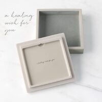 A beautiful and functional box for jewelry and keepsakes. Lid is carved with healing elements of nature and figural imagery. Bottom of box has a velvety soft finish. Detached lid, with sentiment printed on back, can be hung on wall as a decorative plaque