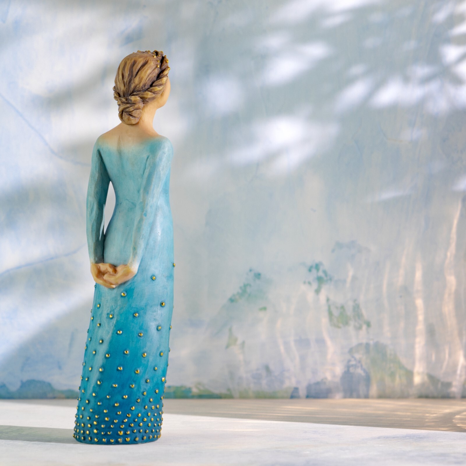 • Available in two skin tones; this piece has lighter skin and hair.