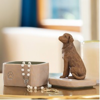 A gift for those who love dogs and treasure their companionship. Keepsake Boxes are small, sweet places to keep jewelry, accessories, notes. Hand-painted lid has three-dimensional carved figure affixed to it; lid is not attached. Inside, bottom of box reveals Always with me, full of personality.