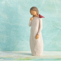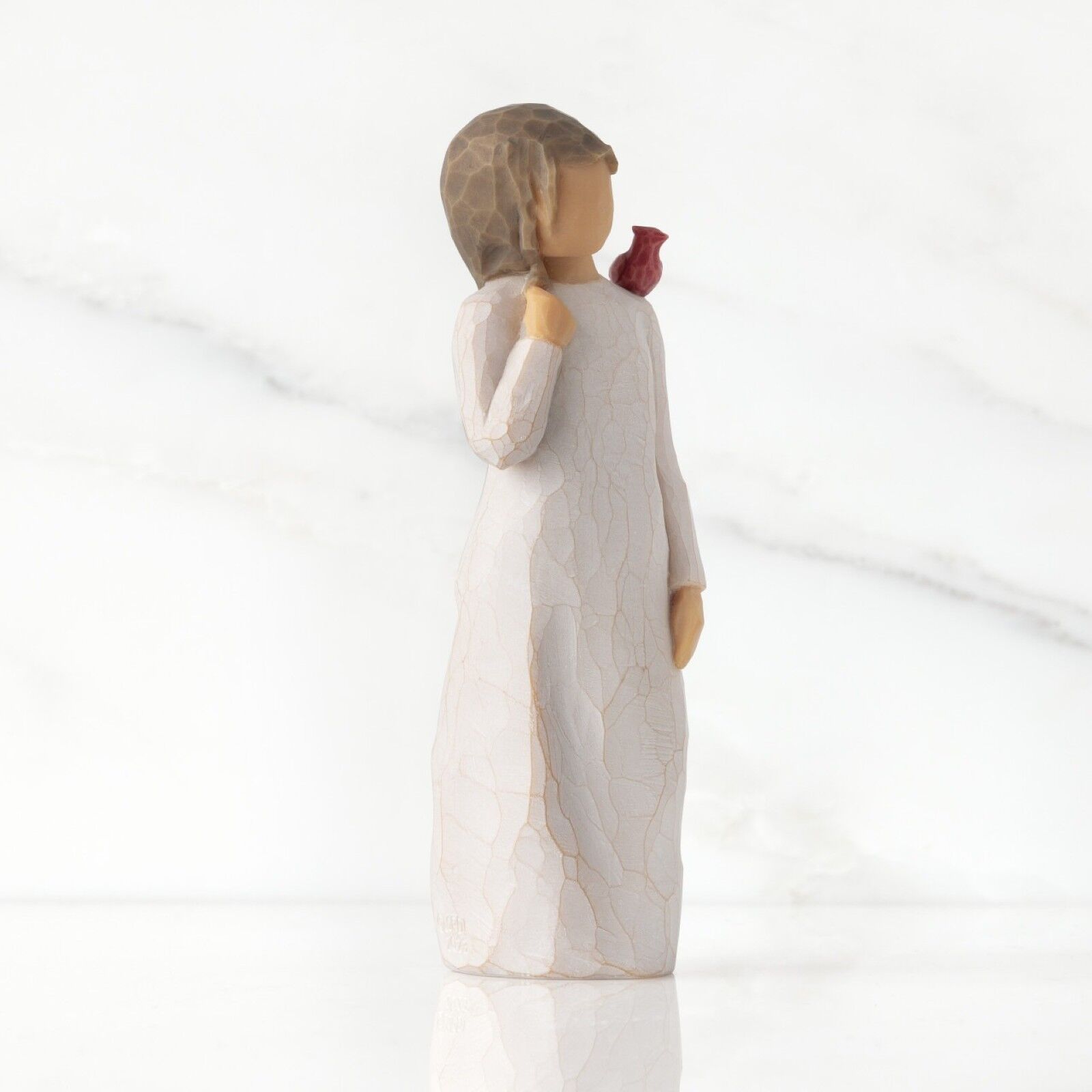 A gift of comfort and healing for one who has lost, or is very far from, a loved one. A reminder that those we love are always with us, in our memories and in our hearts. A red cardinal visits this figure as a small uplifting symbol of remembrance.