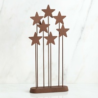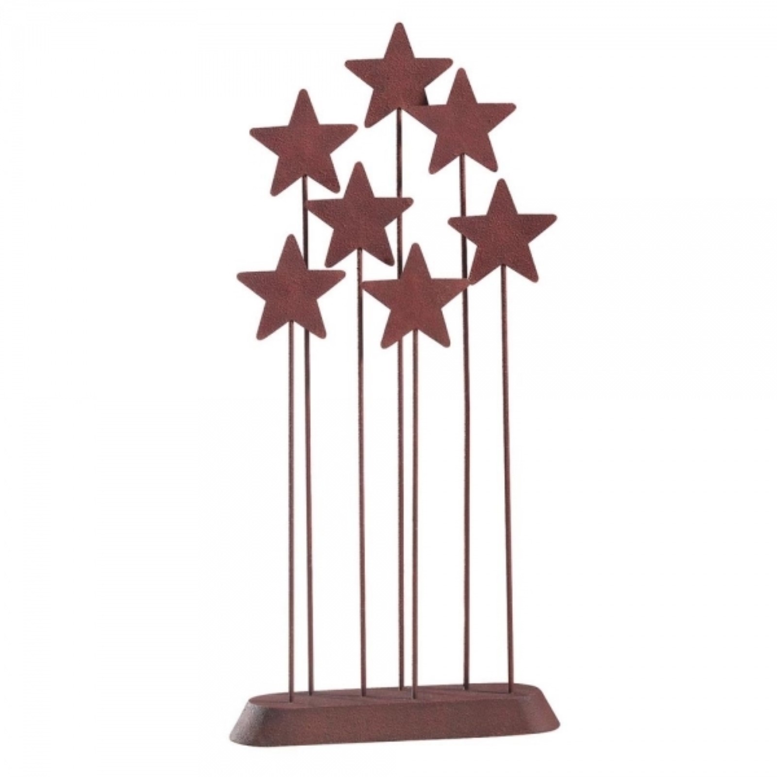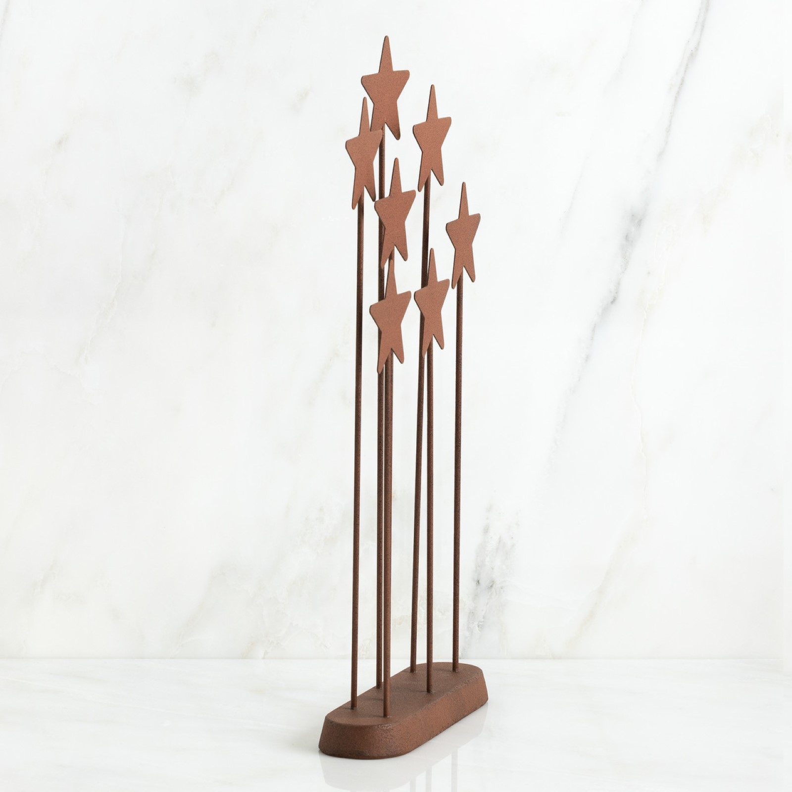 • Comprises 7 rusted LOOK brown metal stars, each atop a metal rod of varying height and affixed to a weighted base.