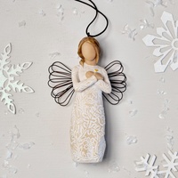Angel in cream dress with wire wings, hands folded at chest, revealing gold-leaf heart. Dress carved with symbols of nature. Hook and loop affixed to figure's head