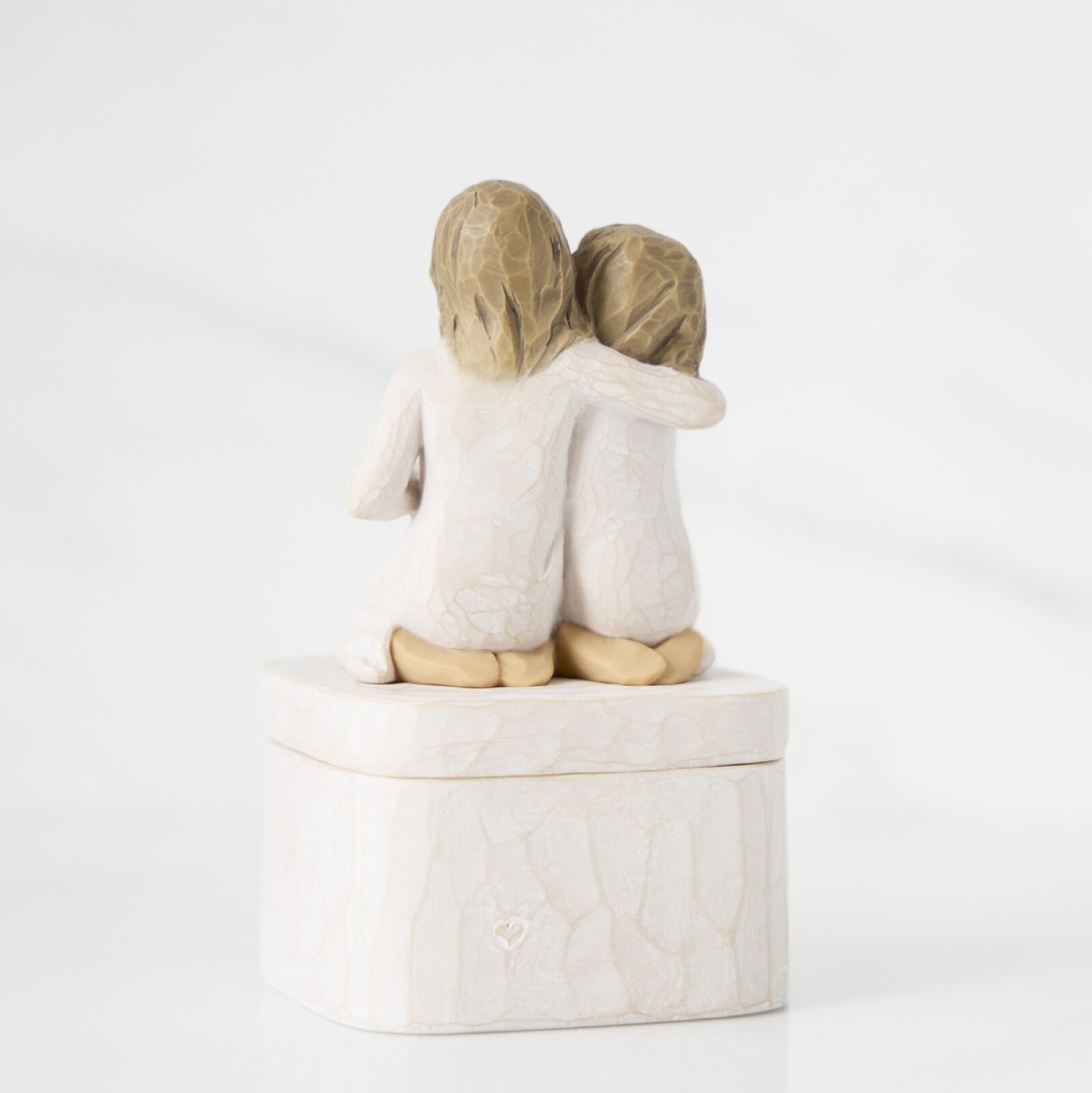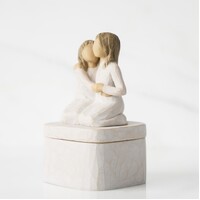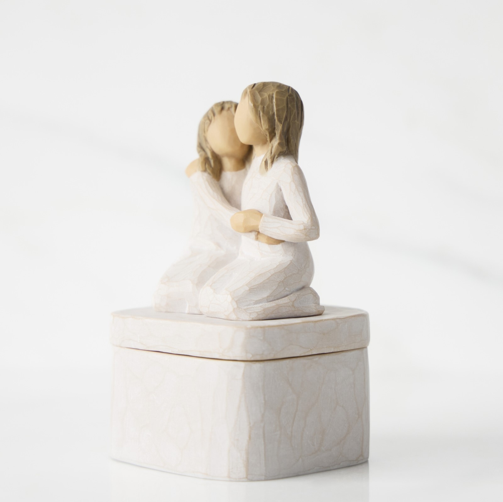 A gift for sisters or friends, or for mothers of daughters. Hand-painted, carved figurative sculpture is affixed to lid of Keepsake Box. Box holds jewelry, hair accessories, small treasures. Inside, bottom of box reveals the sentiment “Nothing comes close to the closeness of sisters”.