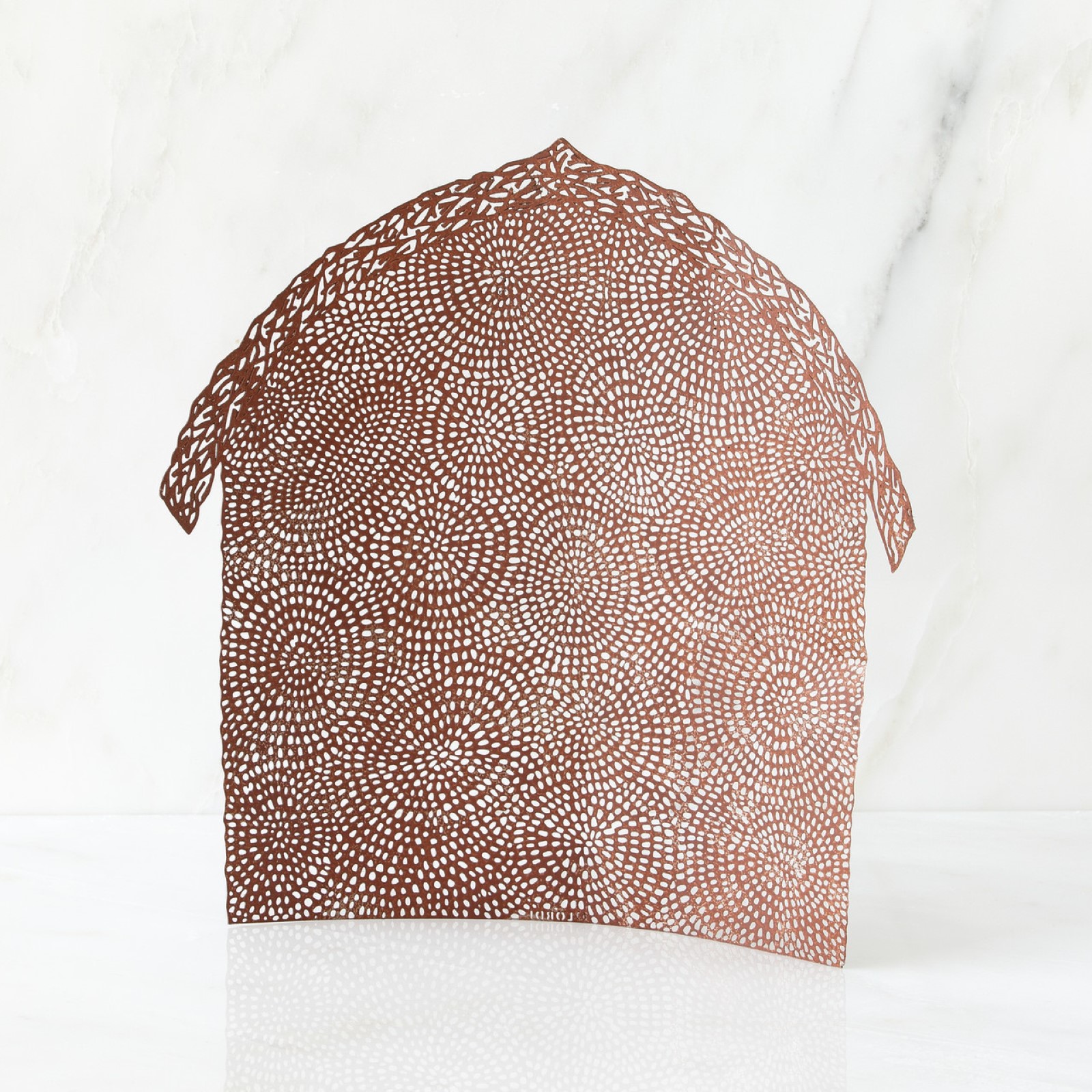 This pierced-metal backdrop was created to complement The Holy Family, though it can be used as a beautiful backdrop for other angels or figures as well. “The repetitive swirling concentric mark-making is suggestive of twinkling stars at night. The roof is an intertwined, organic structure that suggests a bower of twigs or branches. Since the surface patterning is complex with tiny elements, I wanted to pare down the form to the simplest possible. It’s basically a single sheet of pierced metal, curved to allow it to stand and represent a shelter for The Holy Family and animals.” –Susan Lordi