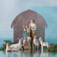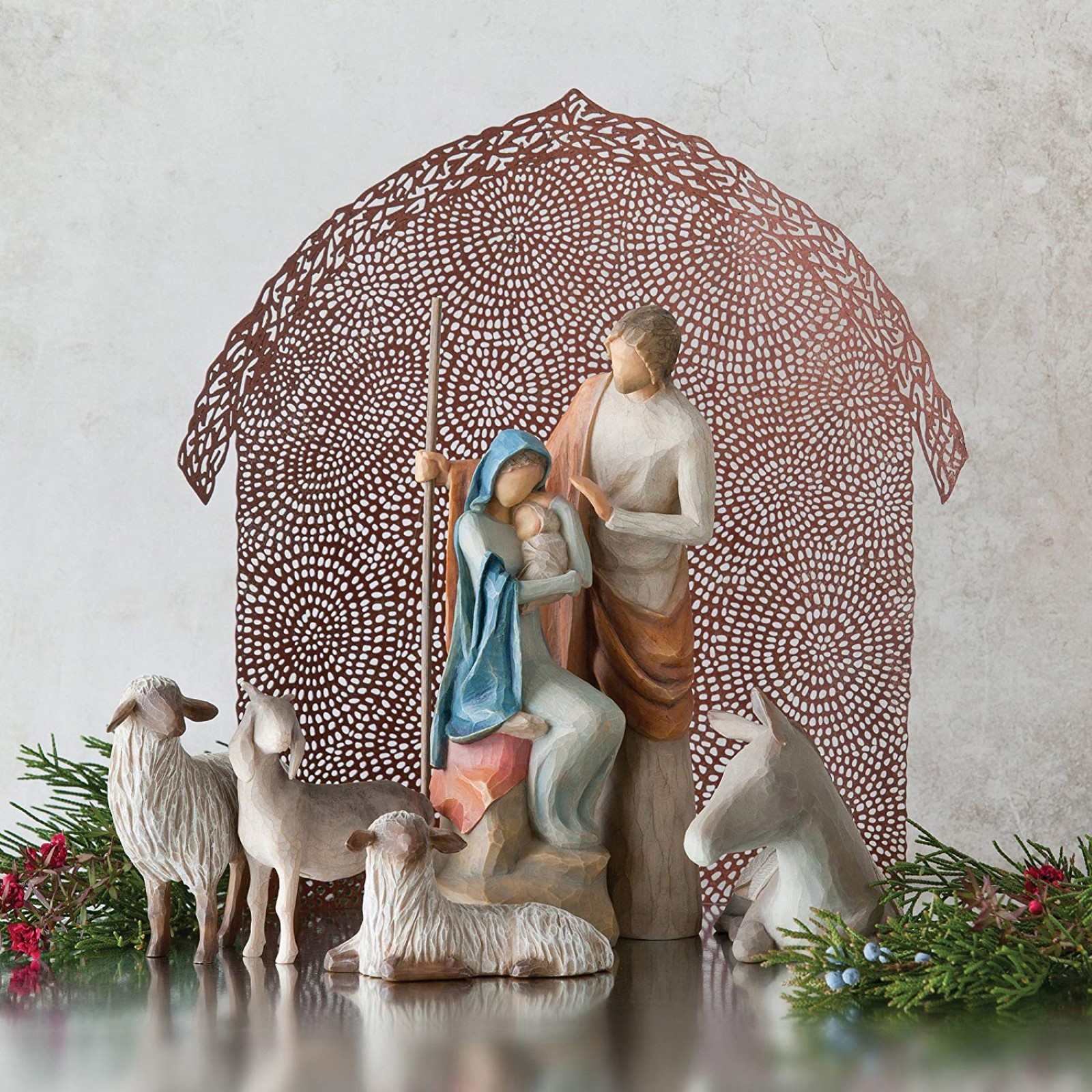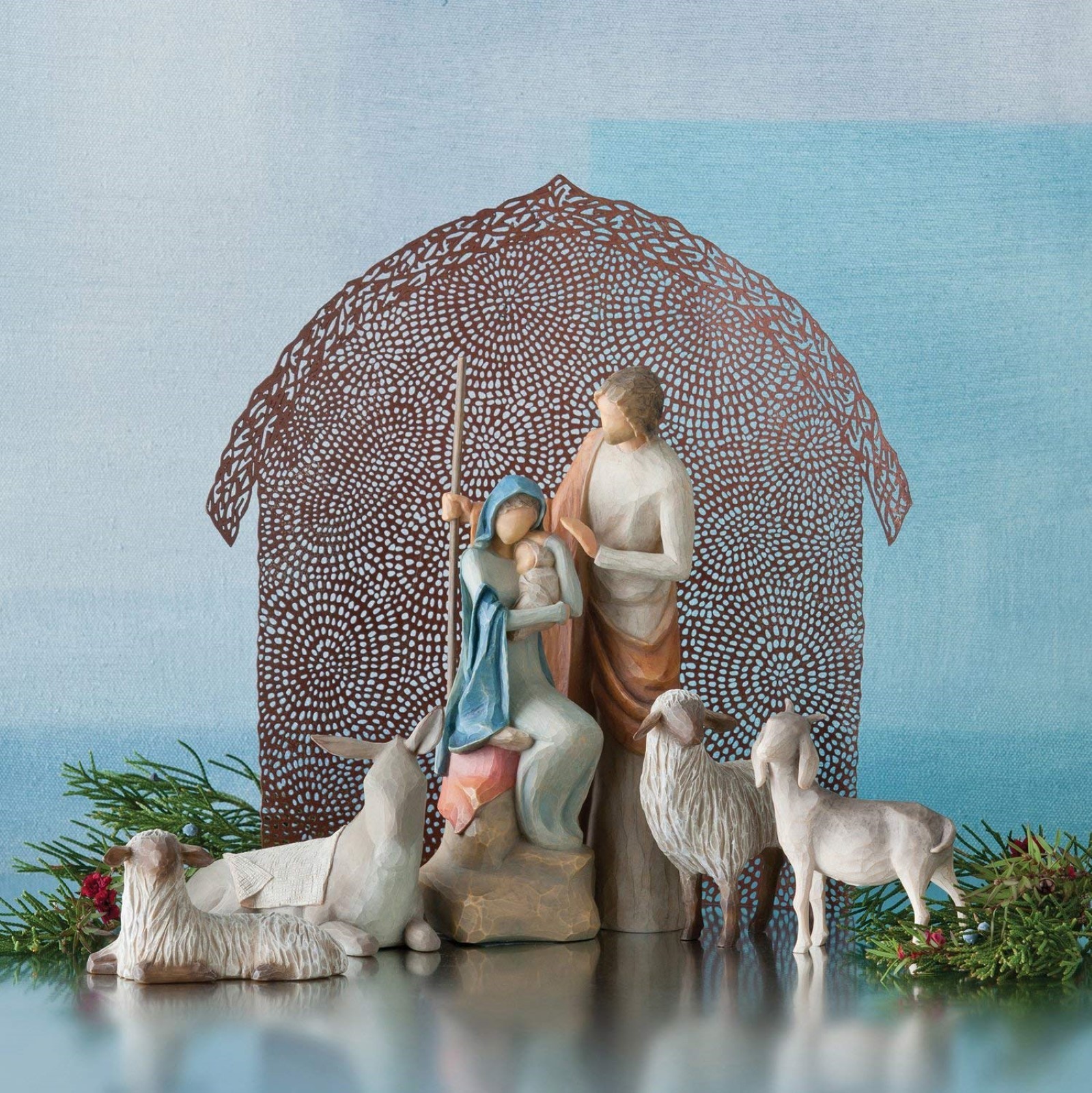 The Holy Family collection is ideal for those looking for a smaller nativity option. The 19cm H (7.5”h) figure is complemented by a backdrop of pierced curved metal, suggestive of twinkling stars. Four animals give watch, warmth and protection.