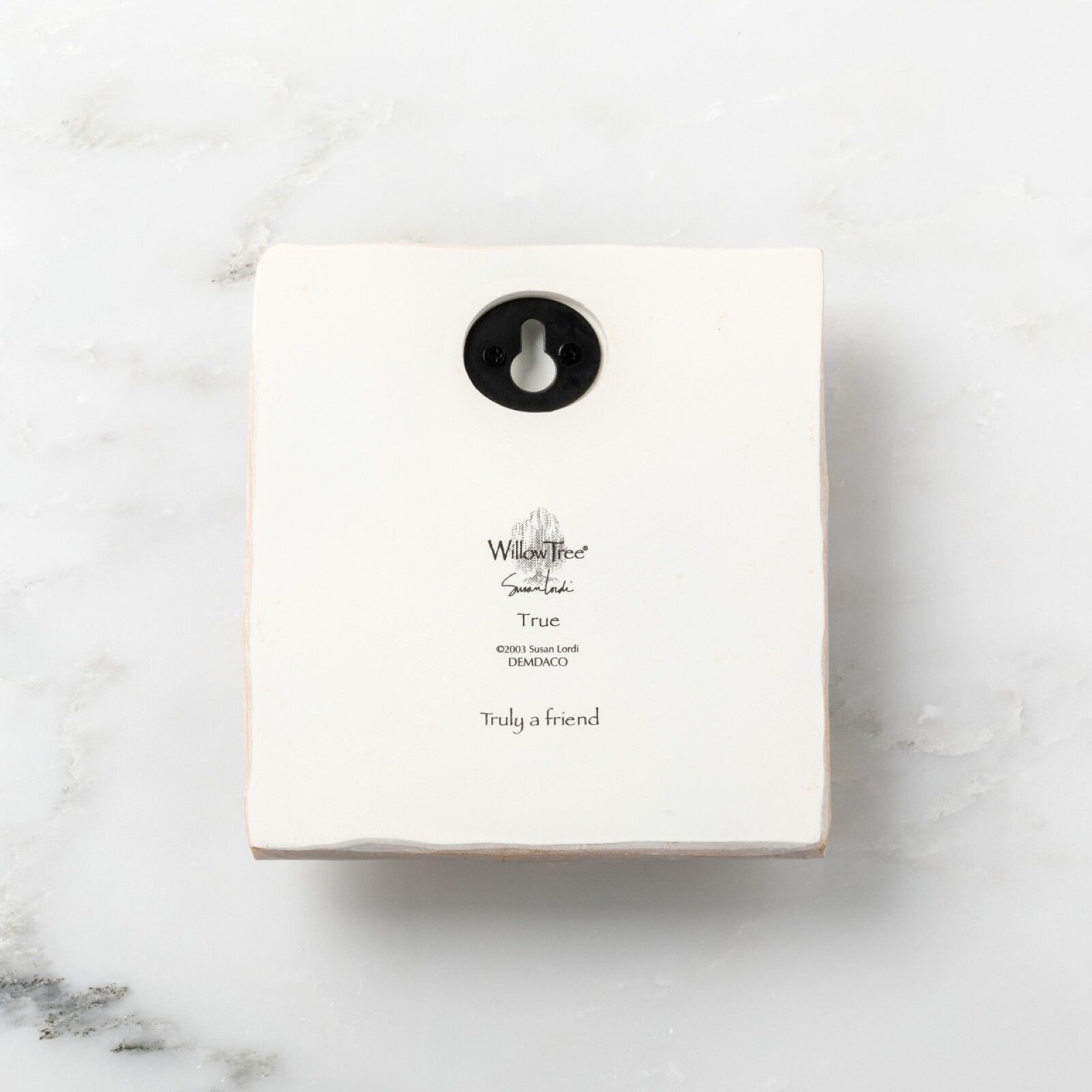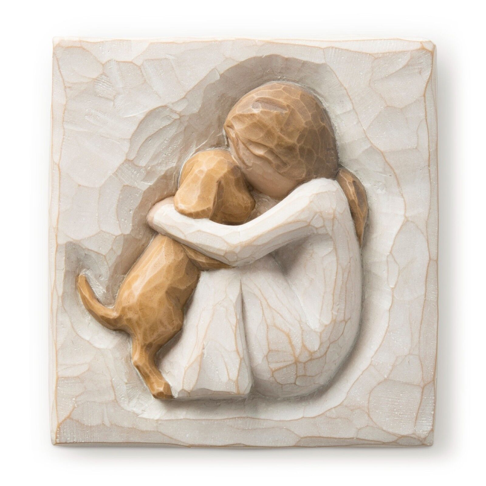 Communicating friendship and a love of pets, this carved bas-relief hand-painted plaque can hang on a wall or be displayed on Plaque Stand.