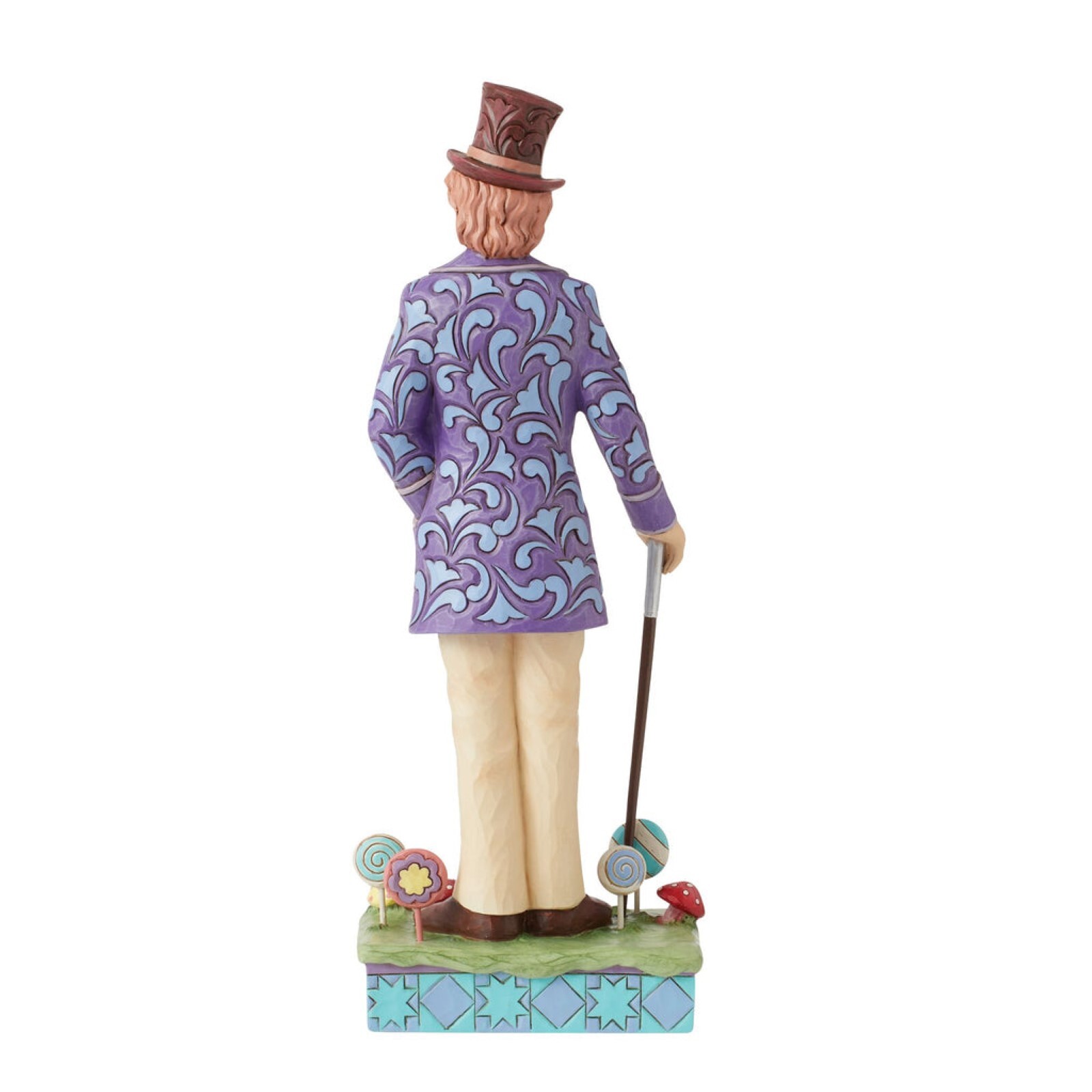 Willy Wonka, the eccentric founder and proprietor of the Wonka Chocolate Factory, poses with personality in this iconic Jim Shore effigy. His emblematic purple and tan suit is fashioned with rosemaling as he stands on a field of candy with a smile.